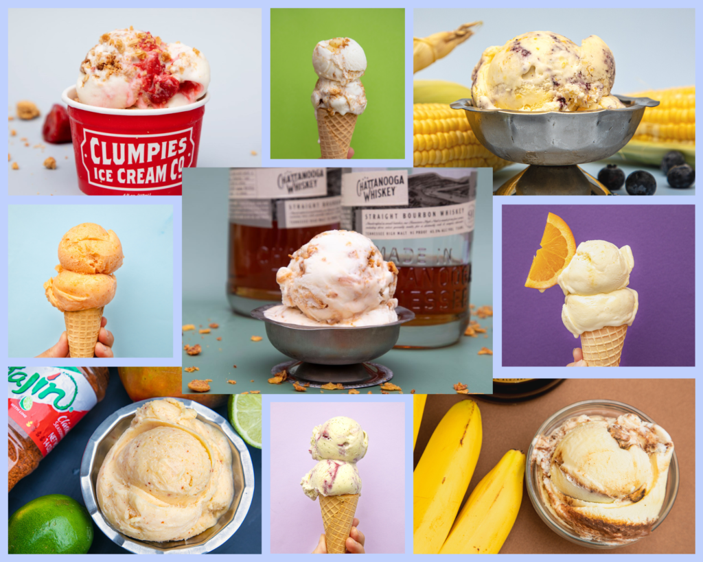 We’re combining flavors with some of our favorite local brands to celebrate our “Silver Jubilee” – that’s 25 years! This online exclusive 25th anniversary pint pack includes six handcrafted ice cream pints. Packed in dry ice in a bright red Clumpies box, our pint packs are ready to ship and make the perfect gift on a hot summer day. Get your Maker’s Collection pint pack now – for a limited time only! Collaborator: MoonPie® – Blueberry MoonPie S’mores Collaborator: Chattanooga Whiskey – Chattanooga Whiskey Ginger Collaborator: Niedlov’s Bakery & Café, Southern Spooning Chocolate Sauce – Chocolate Orange Gingersnap Collaborator: Velo Coffee Roasters, Belle Chocolates- Coffee Chocolate Stracciatella Collaborator: Lookout Lavender- Lemon Lavender Muffin Collaborator: Oddstory Brewing Co. – Oddstory Electric Drift